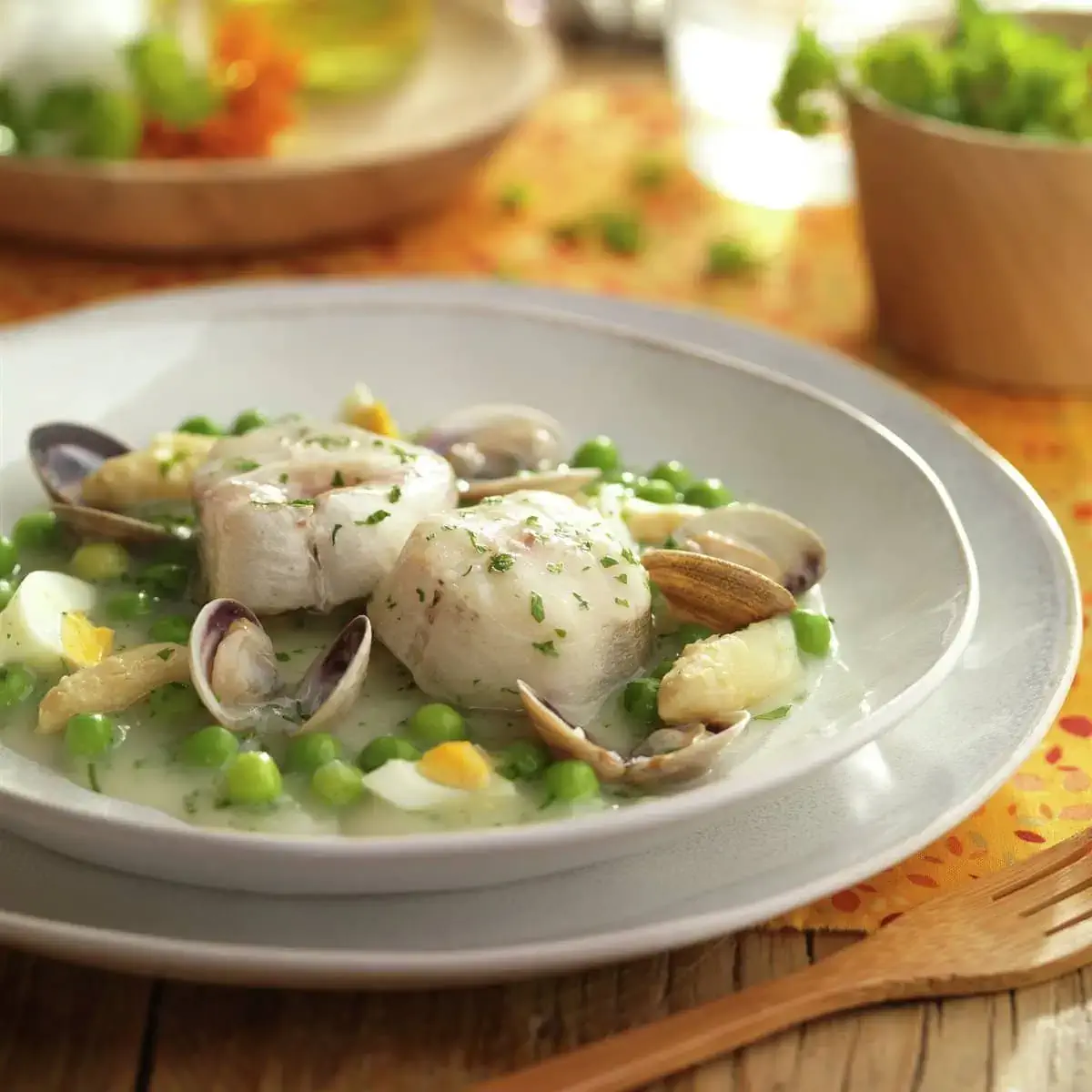 4. Coloca las rodajas de merluza encima de la salsa junto con las almejas y deja cocer a fuego lento durante unos 3 minutos.